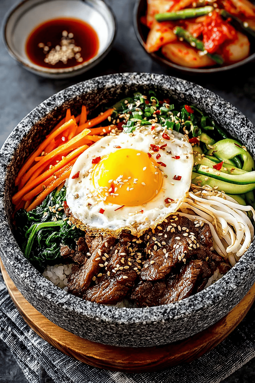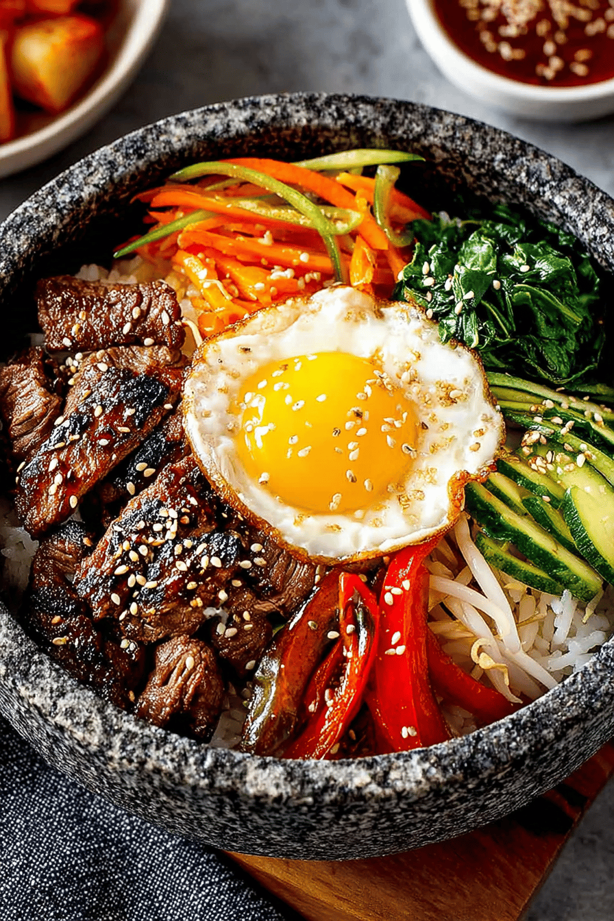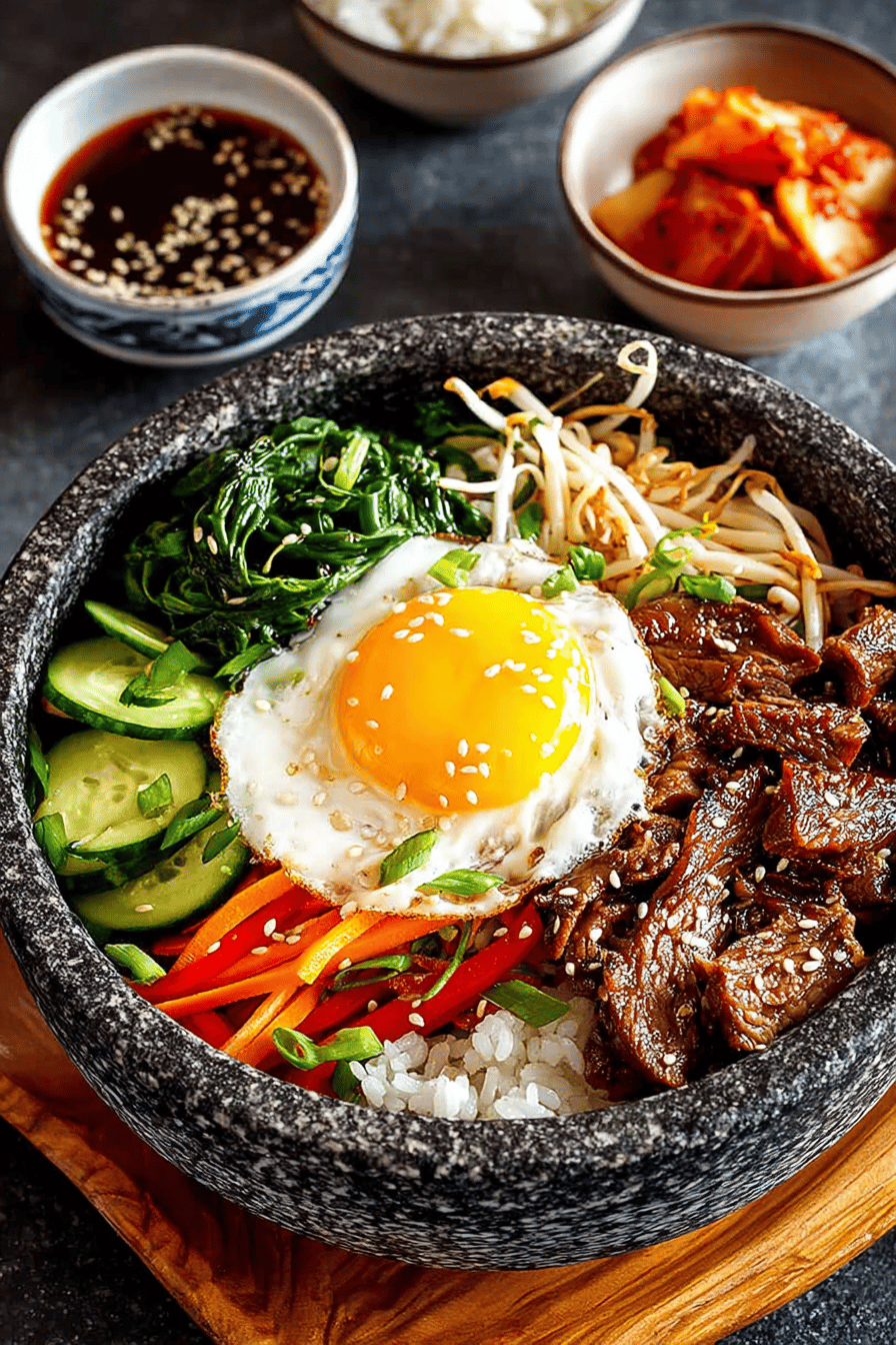 - Assemble the bibimbap bowl by placing rice at the bottom, arranging cooked beef, spinach, shredded carrots, and the fried egg on top. Serve with a dollop of gochujang.