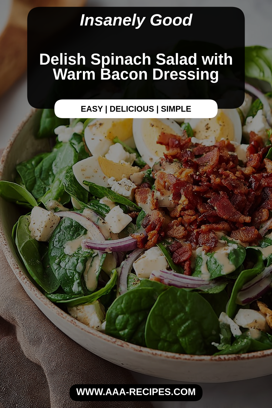 I learned early on that timing is everything here. If the dressing is too hot it completely collapses the greens; if it’s too cool the bacon fat clumps and doesn’t coat anything. The sweet spot is warm dressing poured over the spinach while you’re ready to toss — the heat softens the leaves and carries the bacon flavor through the salad without turning it into mush. Also, generous seasoning matters: bacon contributes salt, but a final squeeze of lemon and a pinch of pepper lift everything. Little touches — like toasting nuts and letting shallots soften in the bacon fat — make the salad feel intentional rather than thrown together.