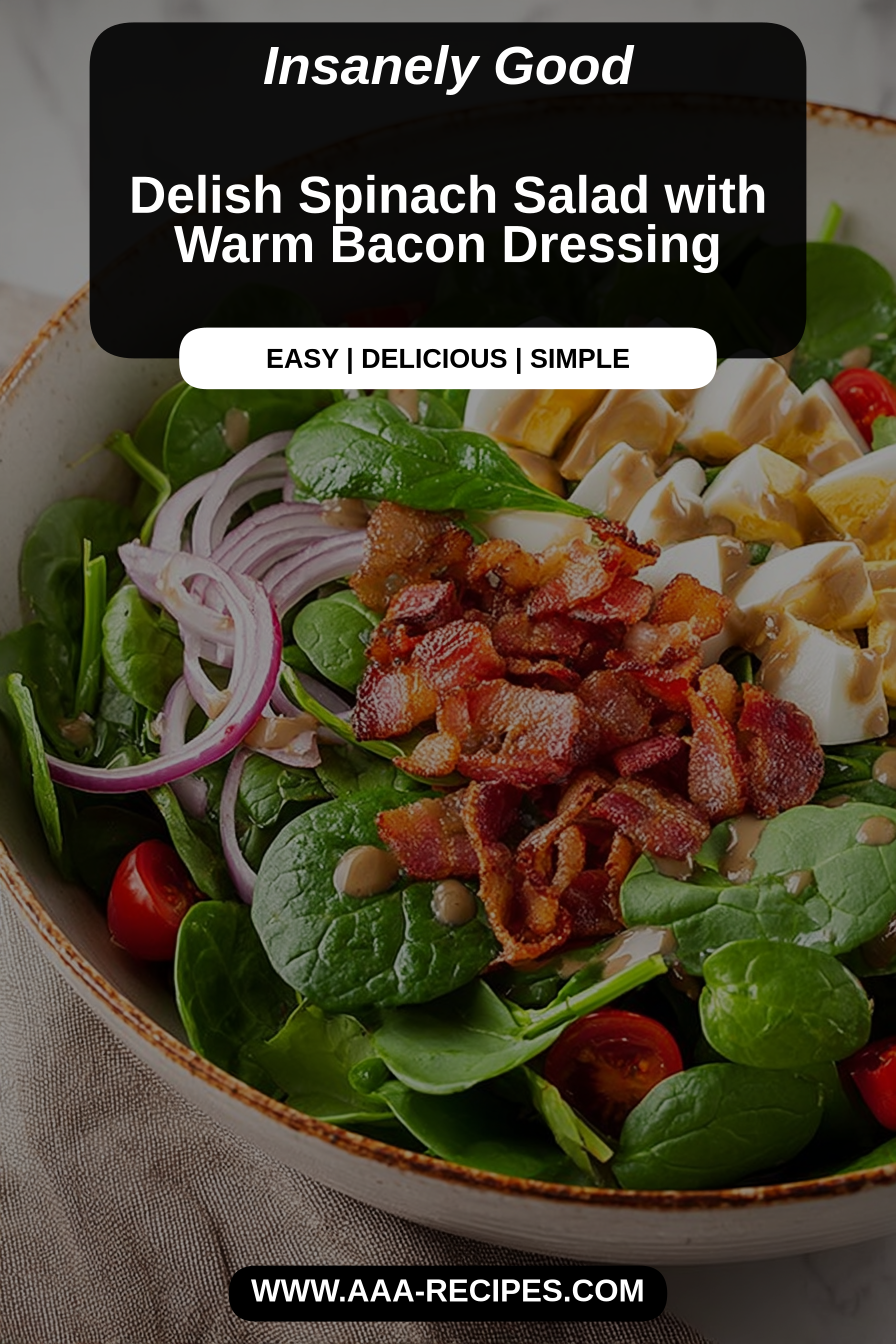 This bright, cozy spinach salad gets its personality from a warm bacon dressing that’s poured over the leaves so the spinach wilts just enough to soften and soak up savory, smoky flavor. It’s that perfect balance of crunchy bacon, tender greens, a little acid to wake everything up, and maybe a scatter of nuts or cheese for richness—simple but unmistakably satisfying. Try it when you want a side that feels elevated without fuss.