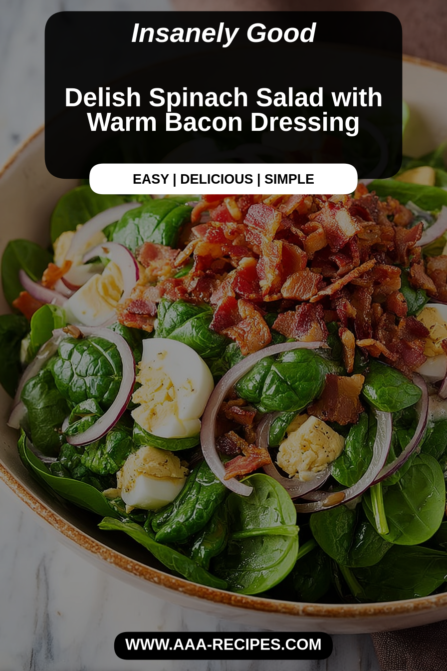 Keep the warm bacon dressing truly warm rather than hot — you want it to wilt the spinach slightly without cooking it. If you find the dressing separates, whisk in a teaspoon of mustard or a splash of warm water to bring it back together. If the salad tastes flat, a quick sprinkle of flaky salt and a squeeze of citrus will wake it up.