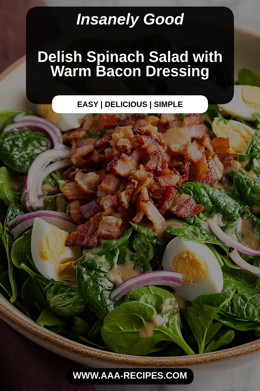 This salad is a riff on classic warm spinach salads where the dressing is made in the pan that cooked the bacon so you capture every bit of flavor. What I’ve learned is to keep the dressing warm but not scalding—too-hot dressing will fully wilt the spinach and can make everything soggy. Also, quality toppings (freshly toasted nuts, sharp cheese) lift the whole dish, so don’t skimp there. If you’re nervous about timing, cook the bacon a little ahead and gently reheat the fat with the aromatics so you still get that fresh, warm finish.