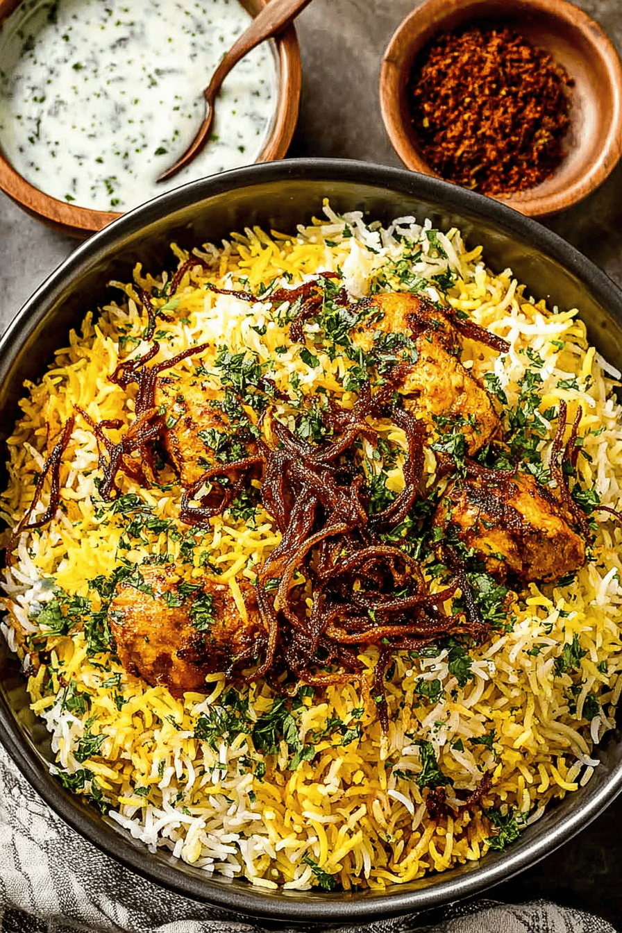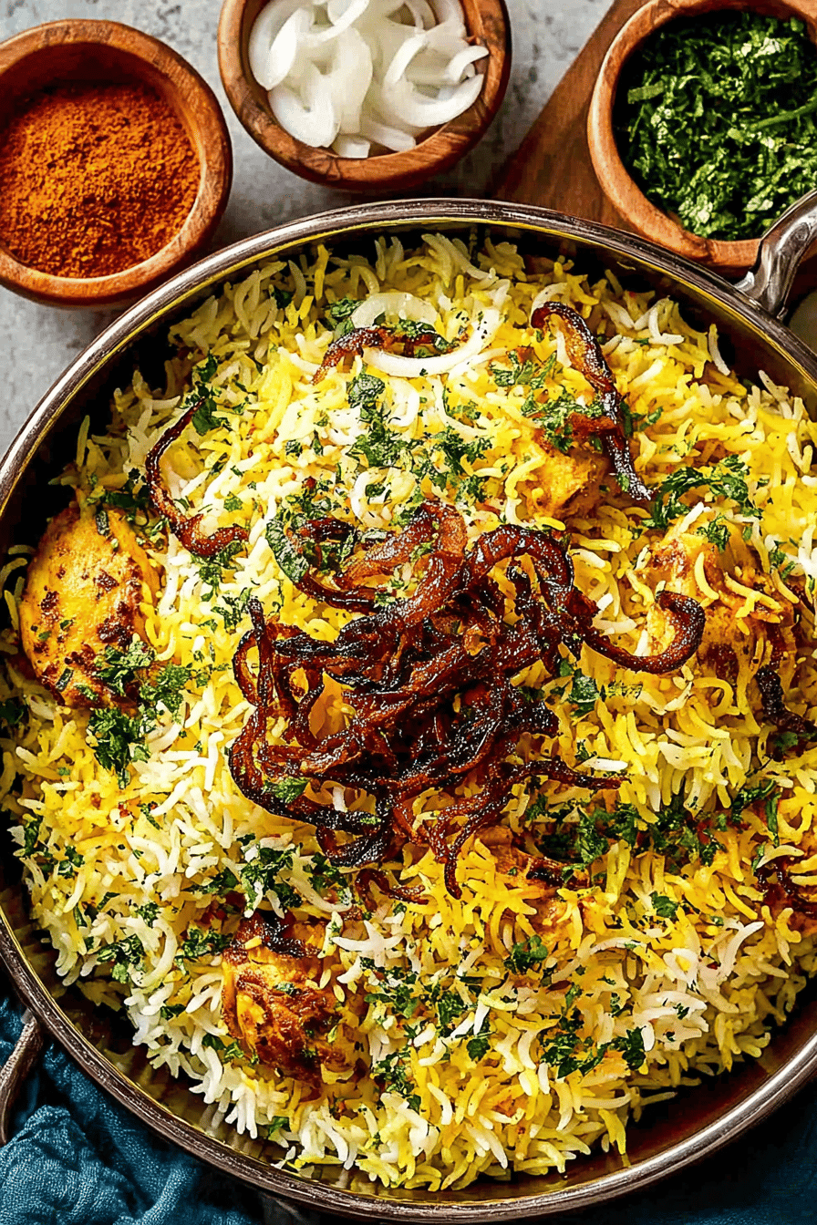 - Remove from heat and let it rest covered for 10 minutes. Garnish with fried onions, cilantro, and mint leaves before serving.