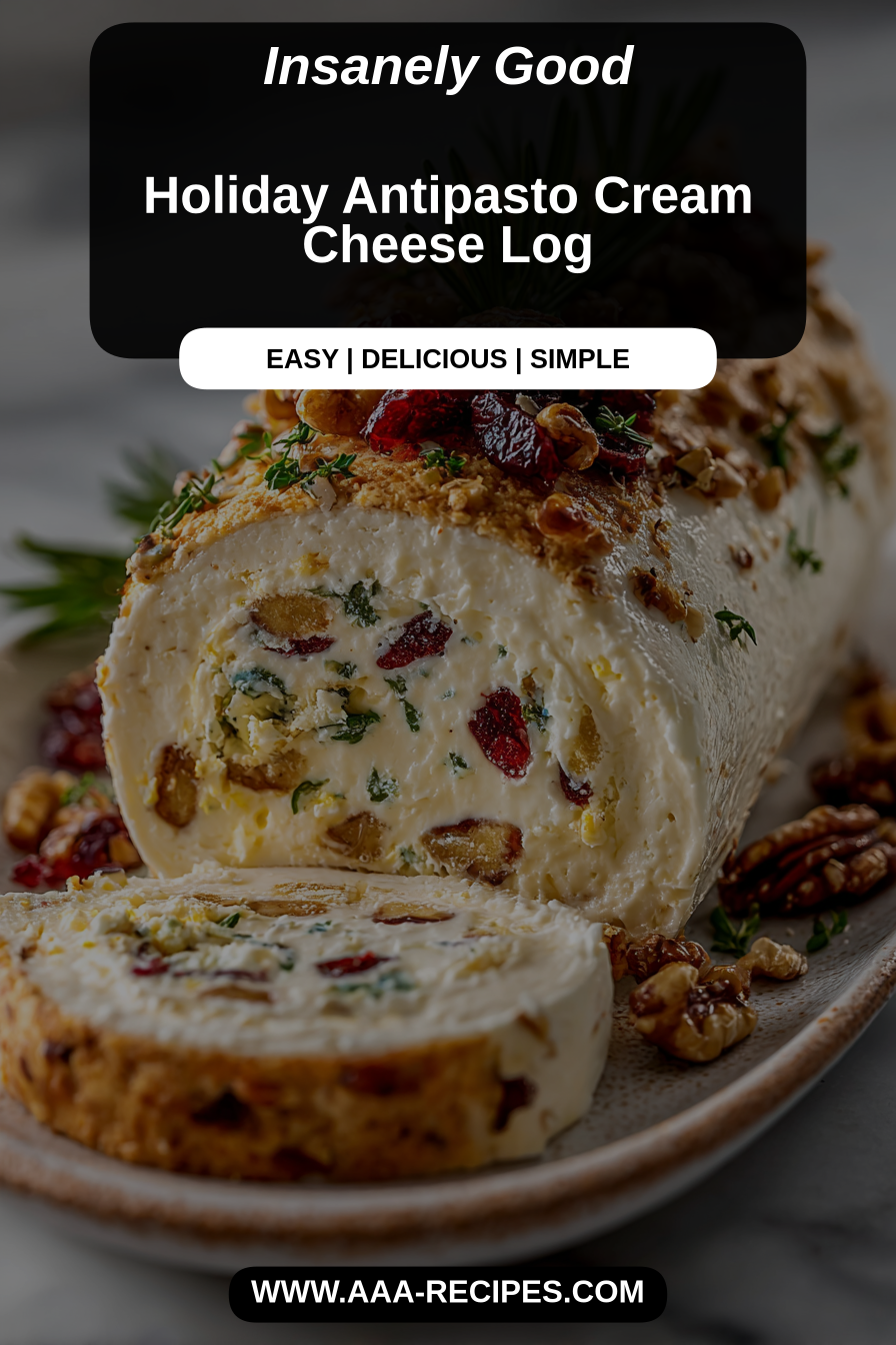 There’s something about an easy, pretty thing you can put at the center of the table that makes a whole meal feel like a small celebration. The Holiday Antipasto Cream Cheese Log is exactly that — a soft, savory log of cream cheese rolled in bright, briny and toasted bits that looks fancier than the handful of minutes it takes to assemble. It’s the kind of dish I make when friends are stopping by, when a light snow has dusted the yard and we’re keeping the kettle on, or when I want a lovely nibble for morning coffee that feels like a treat without any fuss. Honestly, it’s approachable and warm in the same breath: creamy, tangy, and dotted with textures that surprise you in the best way.